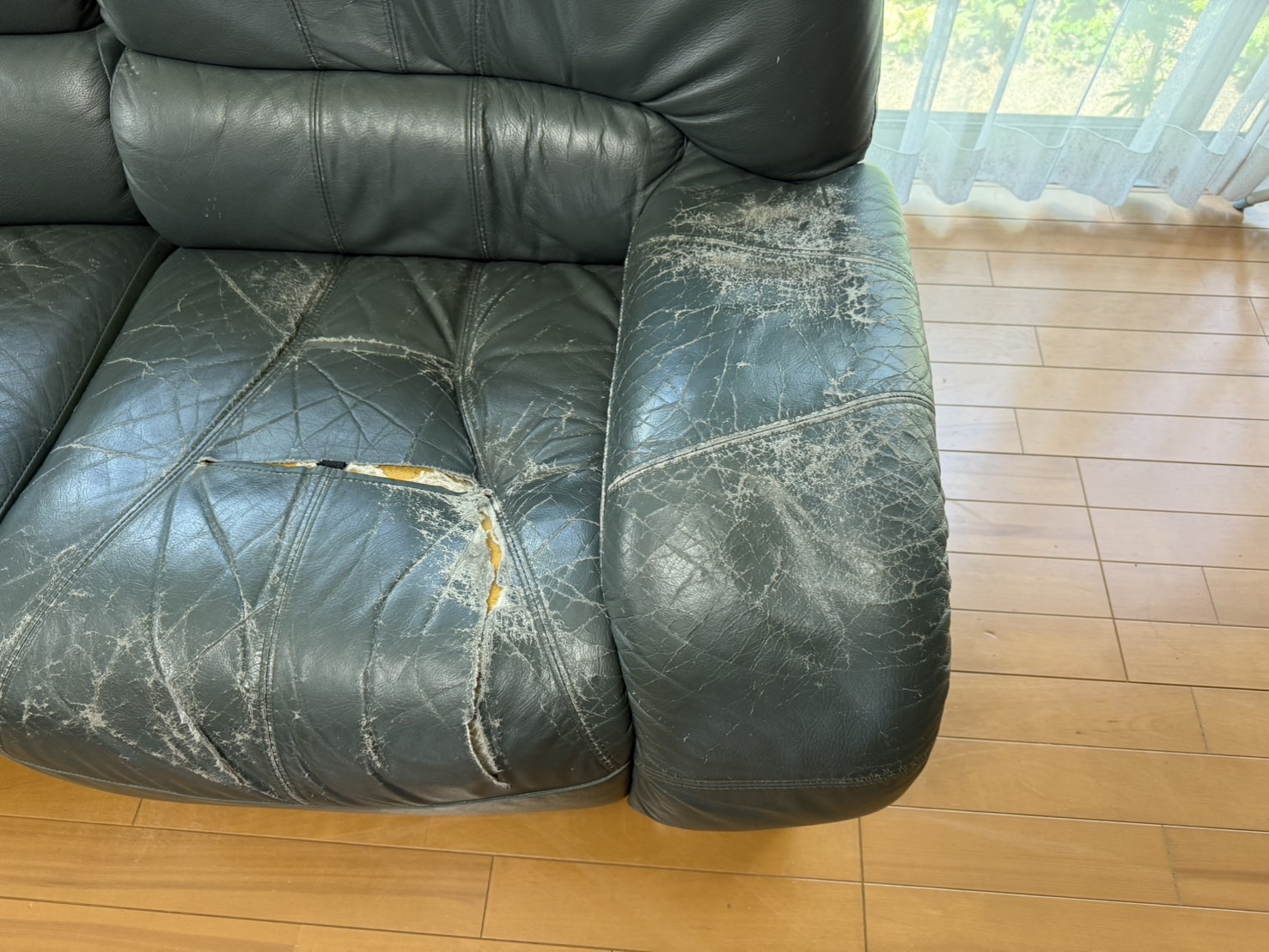 お客様からのご依頼内容は、「座面の破れと色褪せ・ウレタンの修理、肘掛けの色褪せ・弾力の劣化を修正してほしい。30年ほどの使用ですが、大変想い入れのあるソファなので今後も大切に使いたいという内容でした。