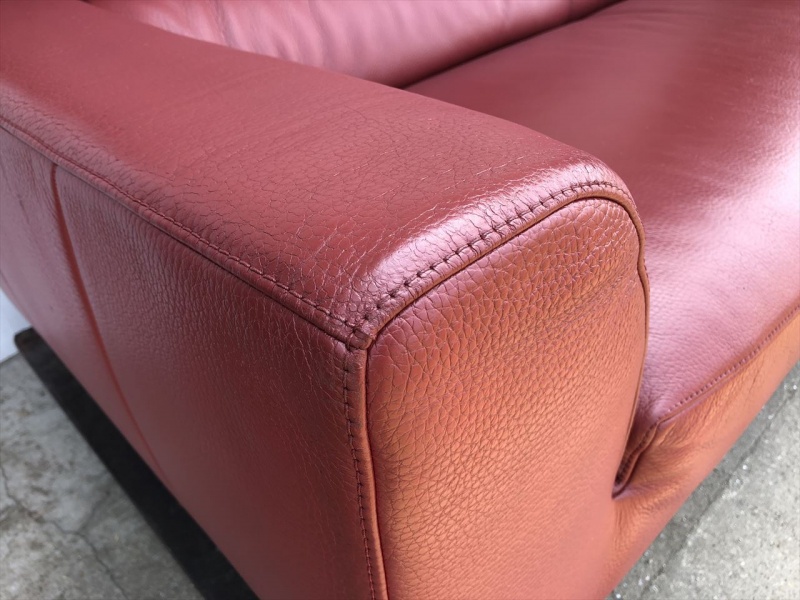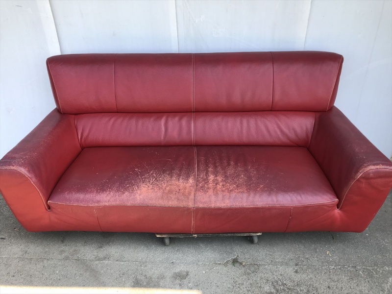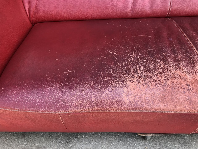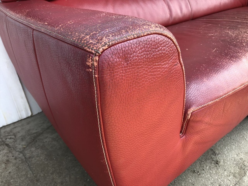10年ほどご使用になられ、革の乾燥、スレ傷、塗膜の剥がれが目立ってきたソファです。