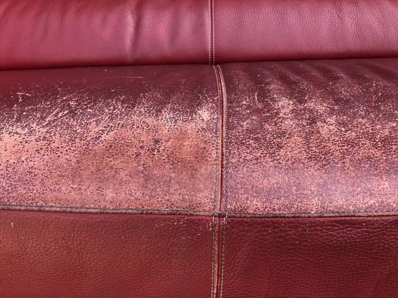 特に座面や肘置きなど、体がよく触れる部分は摩擦が起こりやすく、革の表面が擦れてしまったり、色が薄くなったりすることが多く見られます。